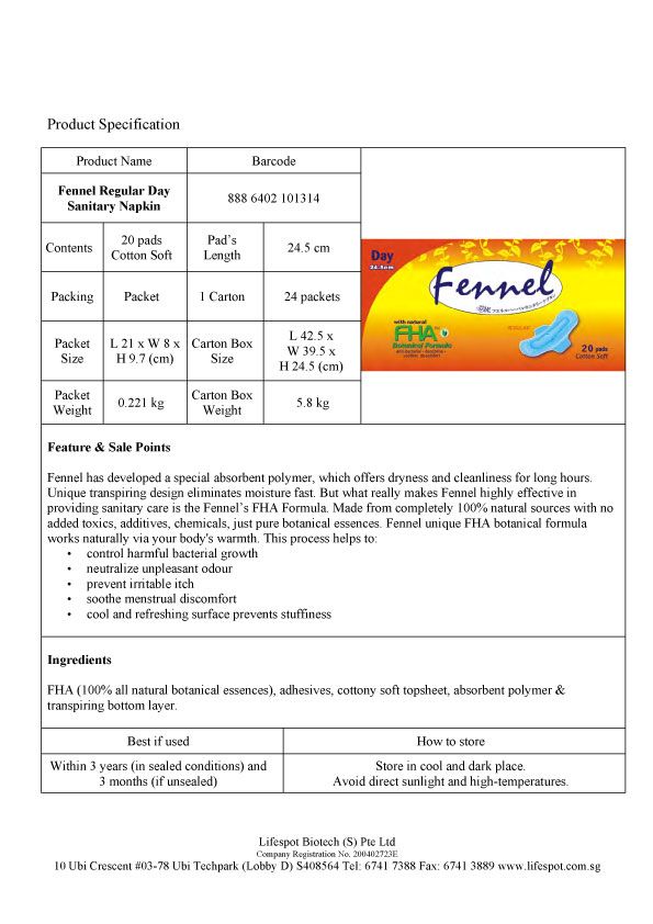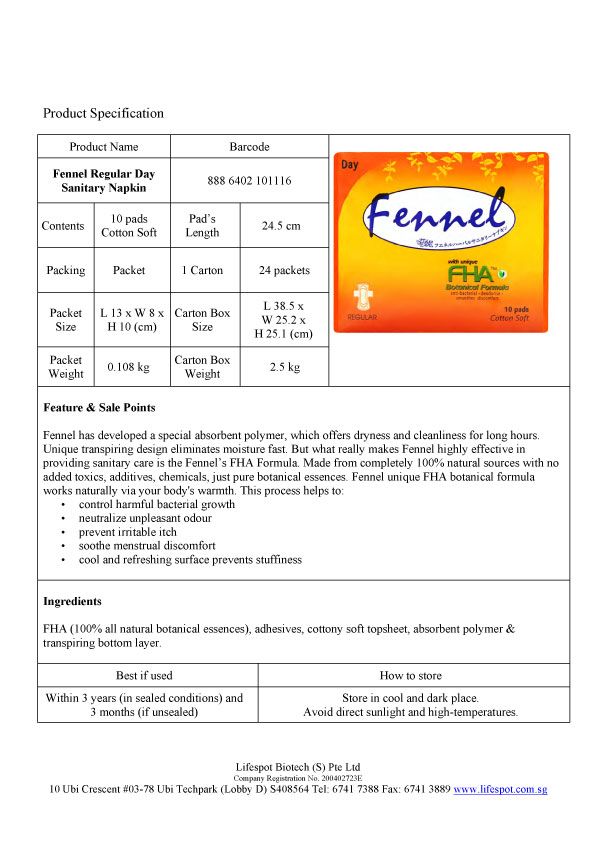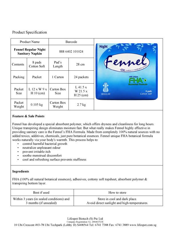 Prof Hsu Wen Chun, renowned American biochemistry and herbalist, discovered that a sanitary napkin, under humid condition, is potentially an excellent breeding ground for bacterial. With concern of women's health and wellness, he elaborately harvest the essences from the finest botanical ingredients, combined them with advanced sanitary technology to produce FENNEL.